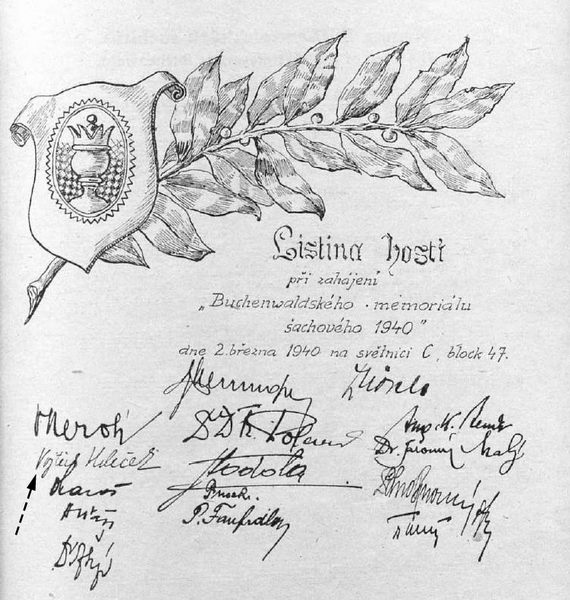 Стрелка указывает на подпись Войтеха Голечека, который в 1-ю мировую войну был участником известного Зборовского сражения между российской и австро-венгерской армиями. (Войтех в том "наступлении Керенского" находился в составе сформированного из пленных чехов и словаков чехословацкого легиона, воевавшего на стороне России. Имел звание майора. Написал спустя несколько лет, в соавторстве, книгу об этом сражении. Жил в Праге, был главным редактором национальной либеральной газеты "Narodny listy". С 1935 по 1939 – депутат Национального собрания (парламента). После войны Голечек станет известен как член Международного комитета бывших узников Бухенвальда – см. ниже.) В статье чешского шахматного журнала рассказывается о трех Бухенвальдских мемориалах, проводились они как лично-командные. В первом 1-2 места поделили автор статьи в "Ческословенски шах" Полански и Леопольд Рейттер, в командном зачете первенствовал блок №47В. Во втором мемориале, состоявшемся два года спустя (и также организованном чешскими узниками), первое место заняли Православ Свобода и команда блока №46В. Войтех Голечек и в том, и в другом мемориалах был капитаном команды блока №46Д. (Известный чешский историк шахмат Ян Календовский написал мне, что многие из его соотечественников, участвовавших в Бухенвальдских мемориалах, уцелели! Их имен нет на скрижалях шахматной истории, в списках мастеров, это были просто любители шахмат, которым любимая игра помогла выстоять, остаться людьми в нацистской неволе).