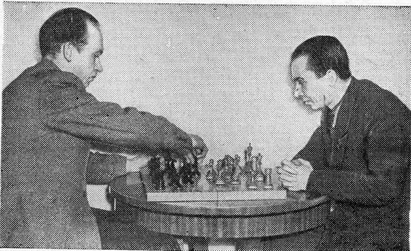 Снимок из статьи "Мужество побеждает": Сергей Богданов (слева) и И.Хейфец. Бывших бухенвальдских узников-шахматистов сфотографировали, вероятно, в редакции "Шахмат в СССР". |