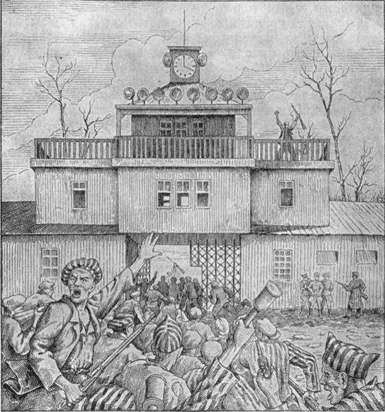 Бухенвальд, 11 апреля 1945-го – повстанцы штурмуют главный вход в лагерь. В результате вооруженного восстания узники обезоружили и захватили в плен более 800 эсэсовцев и солдат охраны (рисунок неизвестного узника-художника). |