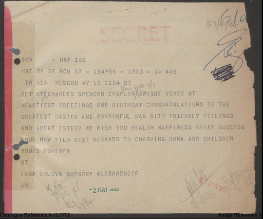 Копия поздравительной телеграммы (подшитой в дело № PF710549) Чаплину из Москвы от его друзей – Любови Орловой и Григория Александрова. Создатель "Веселых ребят" и "Волги-Волги" познакомился с великим комиком, еще когда в конце 20-х проходил стажировку в Голливуде вместе с Сергеем Эйзенштейном и оператором Э.Тиссе.