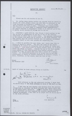 23-я страница досье, на которой старший офицер Секретной службы W.M.T.Magan анализирует полученную оперативным путем информацию. "Чаплин говорил, что вернется в Россию, и это может означать – либо он родом из России, либо собирается еще раз съездить в Россию. Чаплин, возможно, родом из еврейской семьи, – высказывает предположение (созвучное версии фэбээровцев) офицер МИ-5, – бежавшей из-за погромов на Запад в конце 19-го века"...