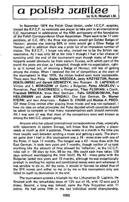 | Начало большой обзорной статьи Митчелла о юбилейном польском турнире, опубликованной в 1979-м в британском журнале о заочных шахматах. |
