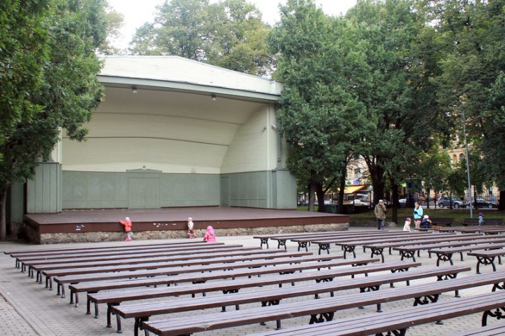 На этих скамейках летнего театра в теплую погоду рижане играют в шахматы