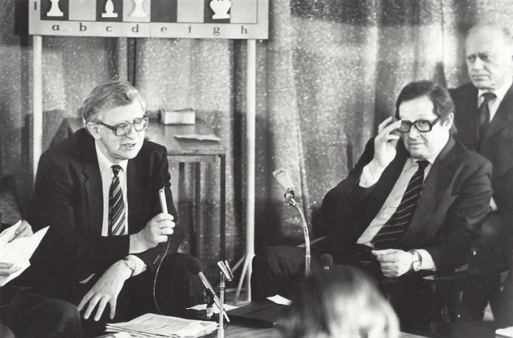 1984. Лекция Смыслова в Политехническом музее. На сцене Ю.Авербах и Я.Рохлин. Фото: В.Некрасов.