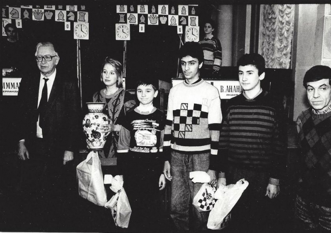 Турнир памяти Алехина. Дворец Съездов, 1992. В.Смыслов и команда Дворца пионеров: Елизавета Журина, Андрей Рычагов, Морис Саруханян, Михаил Кобалия, тренер Виктор Черный