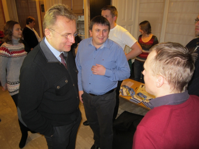 Мэр Львова Андрей Садовый (слева) и директор турнира Назар Фирман (в центре) рассказывают Руслану Пономареву, «почему Львов лучше Киева»