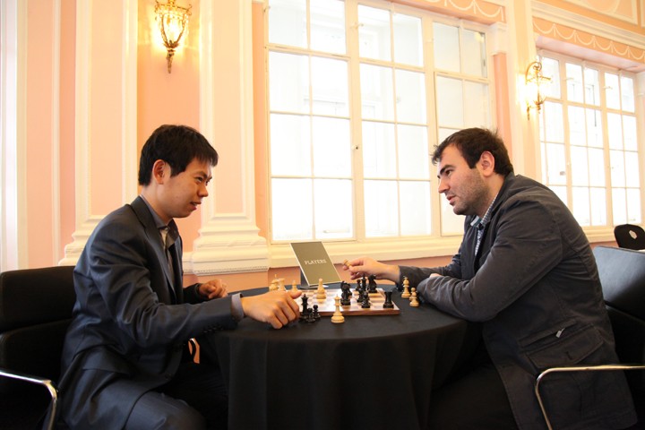 За специальными столиками с табличками «Игроки» шахматисты встречались нередко: Ван Хао и Шахрияр Мамедьяров за анализом партии.