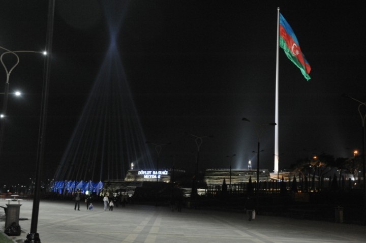 Справа виден национальный флаг Азербайджана. Это только на фотографии он кажется обычным. Когда подходишь ближе, начинаешь понимать, насколько это мощное сооружение! Высота флагштока — 162 метра, диаметр его основания — 3,2 метра, а верхней части — 1,09 метра. Общий вес конструкции — 220 тонн. Ширина флага составляет 35 метров, длина — 70 метров, общая площадь — 2450 квадратных метров, а вес — примерно 350 килограммов!!! Такую махину видно даже из космоса!