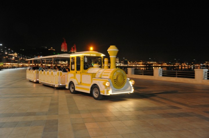 Даже в такое позднее время на набережной можно прокатиться с ветерком на паровозике!