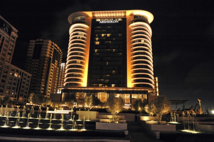 Отель "Absheron" ***** - бывший "Mariott" имеет свою уникальную подсветку, так что шахматисты даже ночью смогут его легко найти!