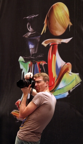 Журналист Евгений Атаров в процессе работы принял позу, похожую на ту, в которой застыли фигуры на плакате.
