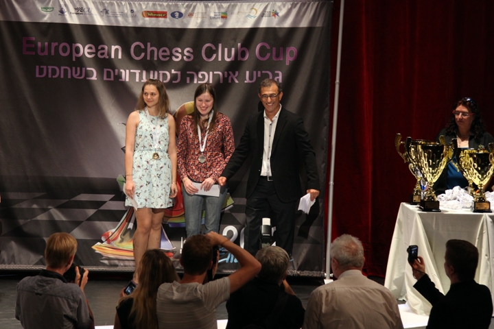 На третьей доске медали получили Анна Музычук, Лилит Мкртчян и Наталья Погонина, но армянская шахматистка на сцену не вышла. С Анной и Натальей на сцене организатор турнира и президент Израильской шахматной федерации Моше Слав.