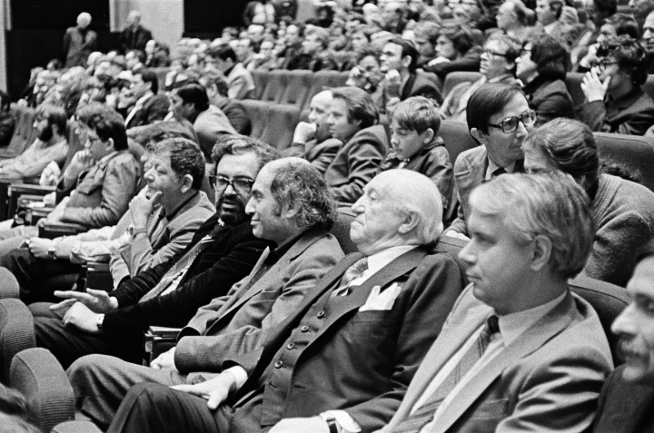В центре Михаил Таль, закончивший партию, со своим секундантом Владимиром Багировым и Мигелем Найдорфом