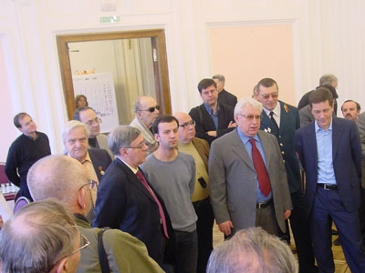 Евгений Васюков открывает соревнование в честь 65-й годовщины Победы под Москвой и рассказывает вице-премьеру РФ Александру Жукову и помощнику Президента РФ Аркадию Дворковичу о победе сборной команды ветеранов России, которую он возглавлял, на чемпионате Европы.