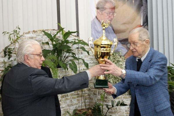 Гроссмейстер Евгений Васюков когда-то жил с юбиляром в одной коммунальной квартире. Евгений Андреевич от имени Комиссии ветеранов РШФ вручил старейшему гроссмейстеру мира Юрию Львовичу Авербаху в честь его 90-летия красивый кубок с богиней Нике на крышке.