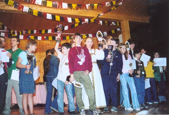 Испания, 2002 г. Моя первая медаль на детском чемпионате Европы. На фотографии призеры турнира. Не уверена, что зрители сразу узнают меня (я в светлых, кажущихся полосатыми, джинсах), но, скорее всего, узнают уже именитых и титулованных на сегодняшний день гроссмейстеров: Яна Непомнящего, Дмитрия Андрейкина и Ильдара Хайруллина, - которые принесли России все 3 медали в своей возрастной группе. С Еленой Таировой, в будущем одной из моих любимых подруг, которая, увы, уже не с нами, мы познакомились на аналогичном чемпионате Европы год назад, где она стала единоличной победительницей. Здесь Лена поделила 1-е место с Анной Музычук, набрав 8 очков из 9, но по коэффициенту стала второй. Зоя Северюхина стала третьей. При желании можно тут узнать еще некоторых шахматистов, но позволю вам догадаться самим :-)