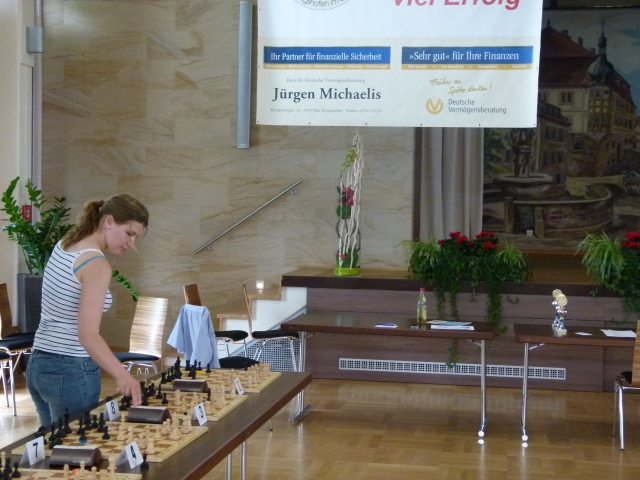 В прошлом году я участвовала в очень необычном сеансе (или турнире) в Германии, проведенном капитаном моей команды. Как видно на фотографии, досок много, а игроков вроде бы нет. Главная идея этого мероприятия была в том, что все участники играют между собой, часто не зная, кто противостоит им на каждой доске. На всех часах был установлен всего 1 час, так что темп моего хождения между досками возрастал с каждым новым кругом, а в конце пришлось перейти на бег Правда, в некоторых партиях я все равно просрочила время.