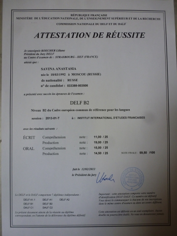 Помимо шахмат у меня нет серьезных увлечений, но иногда хочется хоть немного освоить какую-то новую область. В январе 2013 г. я сдавала экзамен DELF B2 в Страсбурге на знание французского языка, баллов набрала не очень много, но достаточно для получения диплома B2. Так что я довольна!