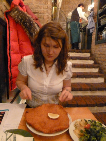 В Париже был проведен один день и на следующий день мы прилетели в Вену. Прочитав, что венский шницель – это то, что обязательно стоит попробовать, я заказала его… Надо признаться, что таких размеров, а в дополнение еще и тарелочки салата я никак не ожидала! Хотя, конечно, много еды – это однозначно лучше, чем мало еды!