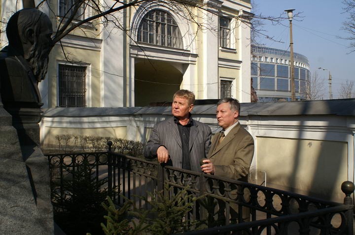 Эти фотографии были сделаны 5 лет тому назад. Анатолий Карпов ездил в Санкт-Петербург, ему вручали медаль Людвига Нобеля за выдающийся вклад в шахматы. Мне в редакции поручили сделать интервью с Карповым. Я сел в «Красную Стрелу», и мы поговорили с Анатолием Евгеньевичем. В поезде мы распили с Карповым и его другом Леонидом Монастырским, режиссером по профессии, бутылку коньяка. Я взял 100-грамовую бутыль на память, попросив Карпова оставить на ней автограф. …В Александро-Невской Лавре, где похоронены великие граждане Санкт-Петербурга, Карпов и Монастырский стояли у могильного памятника Федору Достоевскому, и каждый думал о чем-то своем... Ровно через год, весной 2008-го, Леонид Монастырский был осужден за подготовку покушения на своих соседей по квартире, бывшую жену, ее дочь и мужа дочери... Режиссер, по его словам, на самом деле не собирался никого убивать, а хотел привлечь внимание к своей проблеме...