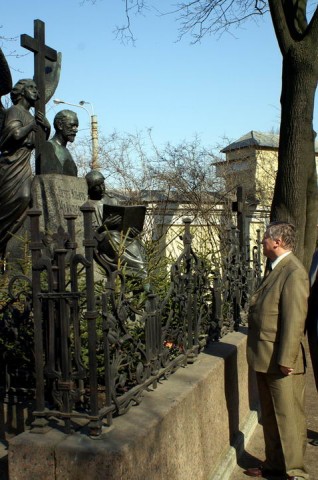 Эти фотографии были сделаны 5 лет тому назад. Анатолий Карпов ездил в Санкт-Петербург, ему вручали медаль Людвига Нобеля за выдающийся вклад в шахматы. Мне в редакции поручили сделать интервью с Карповым. Я сел в «Красную Стрелу», и мы поговорили с Анатолием Евгеньевичем. В поезде мы распили с Карповым и его другом Леонидом Монастырским, режиссером по профессии, бутылку коньяка. Я взял 100-грамовую бутыль на память, попросив Карпова оставить на ней автограф. …В Александро-Невской Лавре, где похоронены великие граждане Санкт-Петербурга, Карпов и Монастырский стояли у могильного памятника Федору Достоевскому, и каждый думал о чем-то своем... Ровно через год, весной 2008-го, Леонид Монастырский был осужден за подготовку покушения на своих соседей по квартире, бывшую жену, ее дочь и мужа дочери... Режиссер, по его словам, на самом деле не собирался никого убивать, а хотел привлечь внимание к своей проблеме...