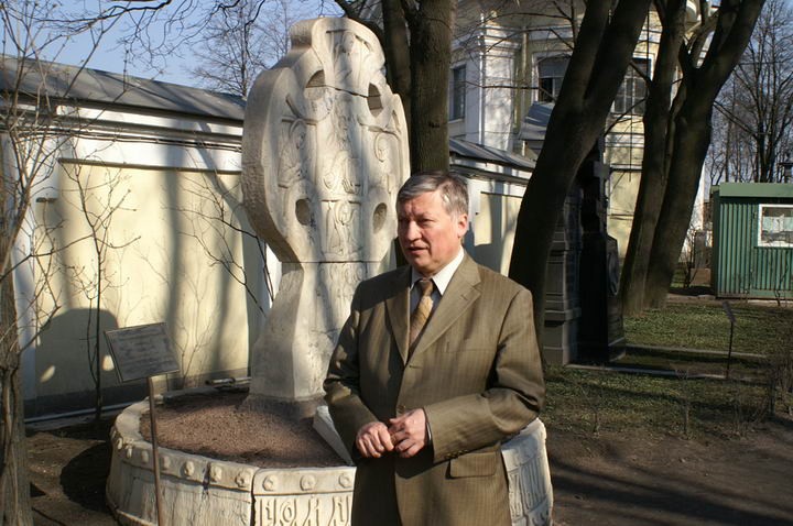 Эти фотографии были сделаны 5 лет тому назад. Анатолий Карпов ездил в Санкт-Петербург, ему вручали медаль Людвига Нобеля за выдающийся вклад в шахматы. Мне в редакции поручили сделать интервью с Карповым. Я сел в «Красную Стрелу», и мы поговорили с Анатолием Евгеньевичем. В поезде мы распили с Карповым и его другом Леонидом Монастырским, режиссером по профессии, бутылку коньяка. Я взял 100-грамовую бутыль на память, попросив Карпова оставить на ней автограф. …В Александро-Невской Лавре, где похоронены великие граждане Санкт-Петербурга, Карпов и Монастырский стояли у могильного памятника Федору Достоевскому, и каждый думал о чем-то своем... Ровно через год, весной 2008-го, Леонид Монастырский был осужден за подготовку покушения на своих соседей по квартире, бывшую жену, ее дочь и мужа дочери... Режиссер, по его словам, на самом деле не собирался никого убивать, а хотел привлечь внимание к своей проблеме...