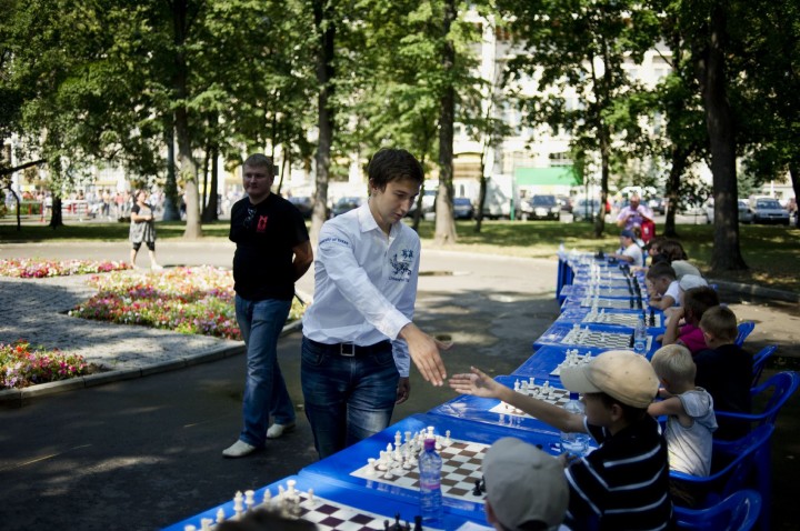 Сегодня в Лужниках состоялся праздник московского спорта. На шахматной площадке, расположившейся в сквере рядом с Престижной аллеей, прошли многочисленные турниры и конкурсы, а также сеансы одновременной игры Анастасии Савиной и Сергея Карякина. Их соперниками были юные шахматисты, серьезно подошедшие к ответственному испытанию.