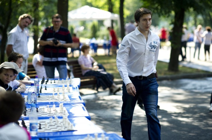 Сегодня в Лужниках состоялся праздник московского спорта. На шахматной площадке, расположившейся в сквере рядом с Престижной аллеей, прошли многочисленные турниры и конкурсы, а также сеансы одновременной игры Анастасии Савиной и Сергея Карякина. Их соперниками были юные шахматисты, серьезно подошедшие к ответственному испытанию.