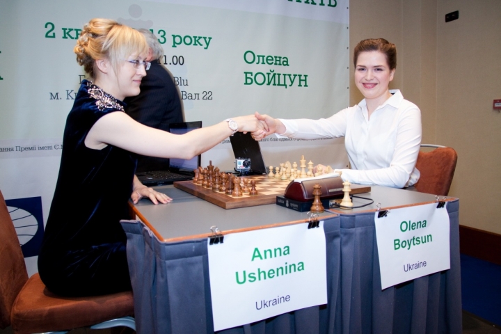 Согласно жеребьевке, белые фигуры достались Елене Бойцун. Она, как чувствовала, и надела на матч белую блузку. Итак, рукопожатие перед партией…