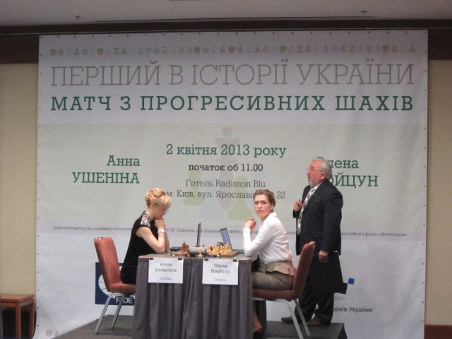 2 апреля в Киеве в шикарном конференц-зале отеля Radisson Blu состоялся матч по прогрессивным шахматам между чемпионкой мира международным гроссмейстером Анной Ушениной и главой правления благотворительного фонда «Детские шахматы» международным мастером Еленой Бойцун. Но журналисты, отбросив титулы и звания, сразу окрестили мероприятие как «Поединок Блондинки и Брюнетки». В ходу была и еще одна версия – «Битва красавиц». В общем, простора для фантазий хватало…