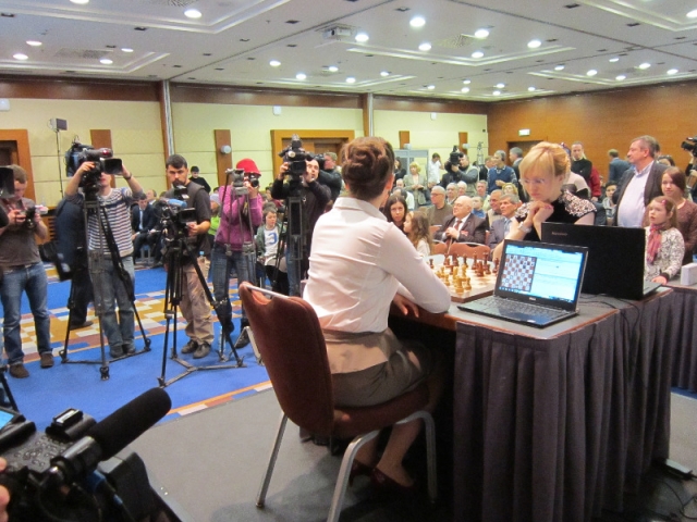 2 апреля в Киеве в шикарном конференц-зале отеля Radisson Blu состоялся матч по прогрессивным шахматам между чемпионкой мира международным гроссмейстером Анной Ушениной и главой правления благотворительного фонда «Детские шахматы» международным мастером Еленой Бойцун. Но журналисты, отбросив титулы и звания, сразу окрестили мероприятие как «Поединок Блондинки и Брюнетки». В ходу была и еще одна версия – «Битва красавиц». В общем, простора для фантазий хватало…