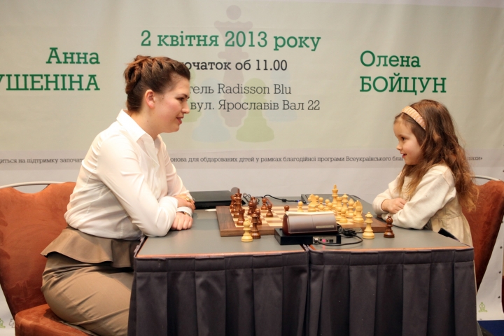 Елена Бойцун сыграла символическую партию с 6-летней Вероникой Веремьюк. Эта чудо-крошка, воспитанница шахматного центра «Товарищ» (тренер Олег Коваль), уже успела стать чемпионкой Киева среди девочек до 8 лет, а на днях выиграла свою возрастную категорию на детском международном турнире «Киевская весна».