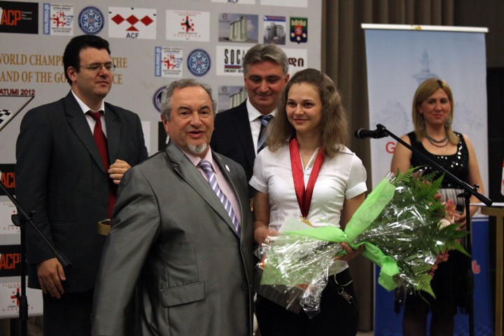 Глава апелляционного комитета Геннадий Несис награждает Анну бронзовой медалью на чемпионате мира по блицу 2012. На заднем плане президент АШП Эмиль Сутовский и президент ГШФ Гия Гиоргадзе.