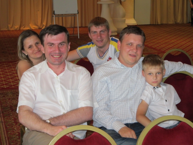 Интересное фото! Последний раз эти ребята собирались такой компанией еще на детских турнирах. Теперь все давно гроссмейстеры… Супруги Анна Зозуля и Вадим Малахатько выступают за Бельгию, Александр Ковчан живет в Харькове, Владимир Баклан – в Киеве… Последний секундирует на чемпионате Руслану Пономареву, но не забывает о семейных обязанностях – вот привел посмотреть на маэстро своего сына – третьеразрядника Кирилла.