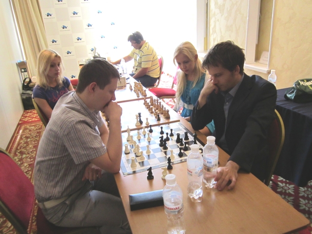 Нескучно было и в пресс-центре турнира. Уникальное фото – за анализом гроссмейстеров Александра Арещенко и Андрея Волокитина наблюдают сразу две блондинки!