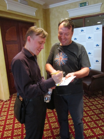 Ему же принадлежит рекорд по розданным автографам. А по количеству взятых у игроков «росчерков» безусловный победитель Вадим Кирилко (на фото с Пономаревым) – известный украинский коллекционер шахматной атрибутики.