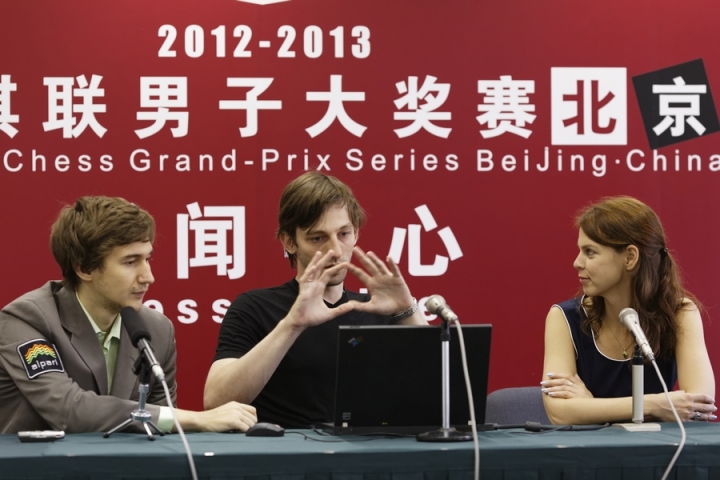 Фотоотчет Александра МОТЫЛЕВА о пятом этапе Гран-при в Пекине поначалу имеет обычную структуру: виды города, портреты участников, сценки в турнирном зале, пресс-конференции, награждение… Начиная со 131-го кадра, требуются небольшие пояснения. 131-138– фотокорреспондент забрел на турнир по го; 139-142 – он в паре с Александром Грищуком играет в настольный теннис против Бориса Гельфанда и Александра Хузмана (камерой в этот момент орудует Анастасия Карлович); 143-161 – на турнире постоянно присутствовали или временами его навещали музы – Цзюй Вэньцзюнь, Хоу Ифань, София Леко, пресс-атташе Анастасия Карлович и арбитр Анастасия Сорокина; 162-170 – сюжет «на десерт»: Василий Иванчук за минуту до начала тура вдруг осведомляется, может ли он налить себе чаю, получает заверения от судьи и партнера, что правило zero tolerance применено не будет, и отправляется к чайному столику. Все довольны.