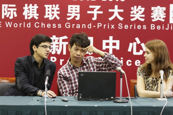 Фотоотчет Александра МОТЫЛЕВА о пятом этапе Гран-при в Пекине поначалу имеет обычную структуру: виды города, портреты участников, сценки в турнирном зале, пресс-конференции, награждение… Начиная со 131-го кадра, требуются небольшие пояснения. 131-138– фотокорреспондент забрел на турнир по го; 139-142 – он в паре с Александром Грищуком играет в настольный теннис против Бориса Гельфанда и Александра Хузмана (камерой в этот момент орудует Анастасия Карлович); 143-161 – на турнире постоянно присутствовали или временами его навещали музы – Цзюй Вэньцзюнь, Хоу Ифань, София Леко, пресс-атташе Анастасия Карлович и арбитр Анастасия Сорокина; 162-170 – сюжет «на десерт»: Василий Иванчук за минуту до начала тура вдруг осведомляется, может ли он налить себе чаю, получает заверения от судьи и партнера, что правило zero tolerance применено не будет, и отправляется к чайному столику. Все довольны.