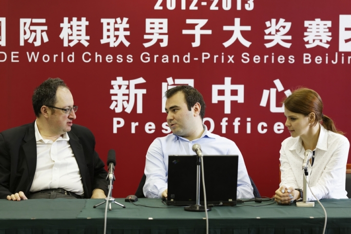 Фотоотчет Александра МОТЫЛЕВА о пятом этапе Гран-при в Пекине поначалу имеет обычную структуру: виды города, портреты участников, сценки в турнирном зале, пресс-конференции, награждение… Начиная со 131-го кадра, требуются небольшие пояснения. 131-138– фотокорреспондент забрел на турнир по го; 139-142 – он в паре с Александром Грищуком играет в настольный теннис против Бориса Гельфанда и Александра Хузмана (камерой в этот момент орудует Анастасия Карлович); 143-161 – на турнире постоянно присутствовали или временами его навещали музы – Цзюй Вэньцзюнь, Хоу Ифань, София Леко, пресс-атташе Анастасия Карлович и арбитр Анастасия Сорокина; 162-170 – сюжет «на десерт»: Василий Иванчук за минуту до начала тура вдруг осведомляется, может ли он налить себе чаю, получает заверения от судьи и партнера, что правило zero tolerance применено не будет, и отправляется к чайному столику. Все довольны.