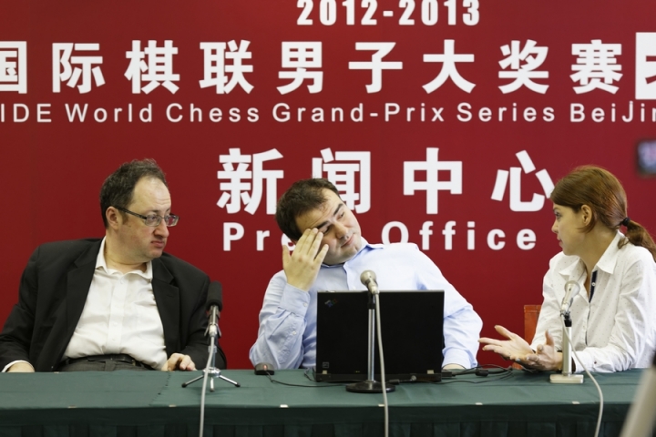 Фотоотчет Александра МОТЫЛЕВА о пятом этапе Гран-при в Пекине поначалу имеет обычную структуру: виды города, портреты участников, сценки в турнирном зале, пресс-конференции, награждение… Начиная со 131-го кадра, требуются небольшие пояснения. 131-138– фотокорреспондент забрел на турнир по го; 139-142 – он в паре с Александром Грищуком играет в настольный теннис против Бориса Гельфанда и Александра Хузмана (камерой в этот момент орудует Анастасия Карлович); 143-161 – на турнире постоянно присутствовали или временами его навещали музы – Цзюй Вэньцзюнь, Хоу Ифань, София Леко, пресс-атташе Анастасия Карлович и арбитр Анастасия Сорокина; 162-170 – сюжет «на десерт»: Василий Иванчук за минуту до начала тура вдруг осведомляется, может ли он налить себе чаю, получает заверения от судьи и партнера, что правило zero tolerance применено не будет, и отправляется к чайному столику. Все довольны.