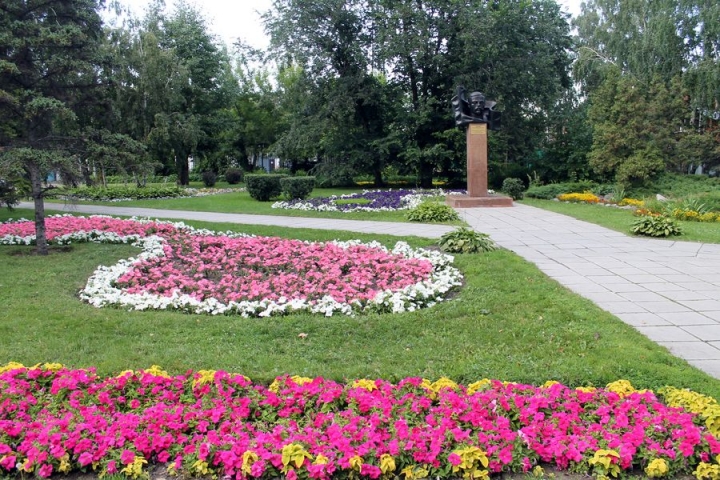 Красивый сквер, в глубине – памятник большевику, расстрелянному в 1918 году белогвардейцами