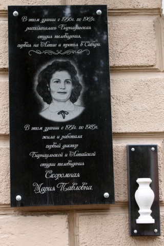 В городе чтут память не только революционеров. Эта доска – в память о Марии Павловне Скоромной, первом дикторе Барнаульской и Алтайской студии телевидения