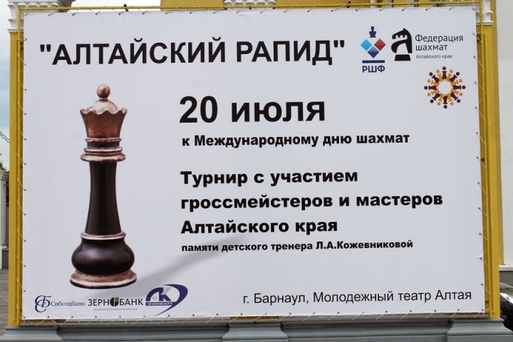 20 июля, в Международный день шахмат на малой сцене барнаульского Молодежного театра имени Валерия Золотухина прошел «Алтайский рапид» – традиционный турнир с участием сильнейших шахматистов края и приглашенных мастеров и гроссмейстеров. Гостеприимные хозяева Артем Поломошнов и Максим Герасимюк устроили небольшую экскурсию по городу, показали просторный краевой шахматный клуб, который открылся недавно в самом центре Барнаула на улице Гоголя (почти как ЦДШ в Москве!). Своими впечатлениями делится один из гостей праздника журналист Владимир БАРСКИЙ.