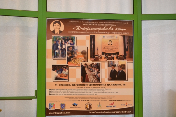 В Днепропетровске с 14 по 22 сентября уже во второй раз прошел международный шахматный фестиваль «Днепропетровская осень» памяти международного гроссмейстера Александра Мороза. На этот раз увеличилось и количество турниров (добавился блиц с обсчетом международных коэффициентов, победителем вышел днепропетровец Д.Кононенко), и количество участников (с прошлогодних двухсот - до почти четырехсот участников из 8 стран в этом году), и улучшился квалификационный состав (12 гроссмейстеров только в основном опене). По сути, фестиваль стал самым масштабным мероприятием в украинских шахматах в текущем году. Краткий фотоочерк о фестивале представляет международный мастер, заместитель Председателя Днепропетровской областной федерации шахмат Дмитрий МАРКИН.