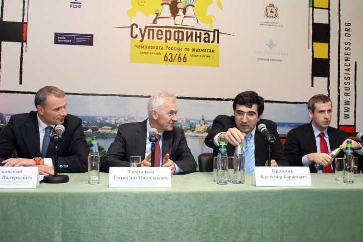 Торжественную церемонию открытия Суперфинала предваряла пресс-конференция, в которой приняли участие 14-й чемпион мира Владимир Крамник, заместитель Губернатора, заместитель Председателя Правительства Нижегородской области Дмитрий Сватковский (олимпийский чемпион 2000 года в современном пятиборье), известный предприниматель Геннадий Тимченко и председатель Правления РШФ Илья Левитов. Журналистов, в том числе телевизионщиков, собралось никак не меньше полусотни, так что интерес к шахматному состязанию высок необычайно.