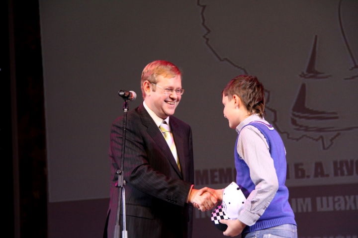 Председатель Шахматной федерации Кемеровской области, член Наблюдательного совета РШФ Максим Ивахин награждает юного Семена Бочкарева, который накануне обыграл в сеансе одного из гроссмейстеров