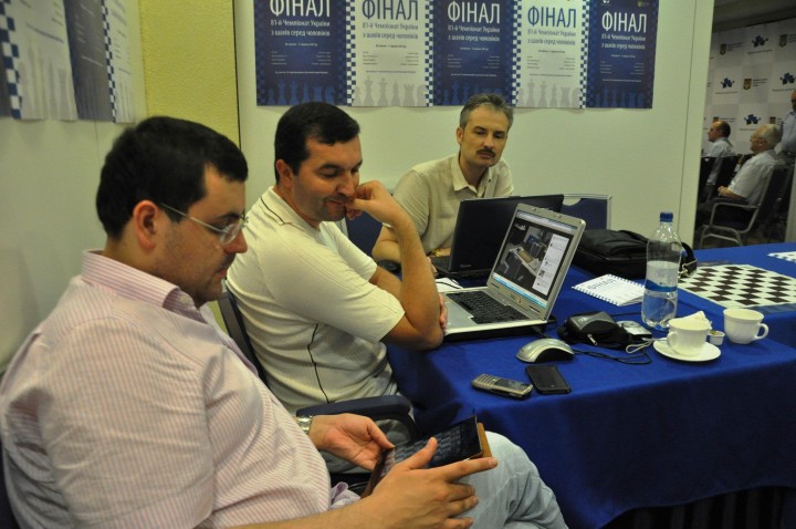 Пресс-центр чемпионата. Президент Федерации шахмат Киева Павел Куфтырев вместе с программой Shredder «наблюдают» за партиями участников.