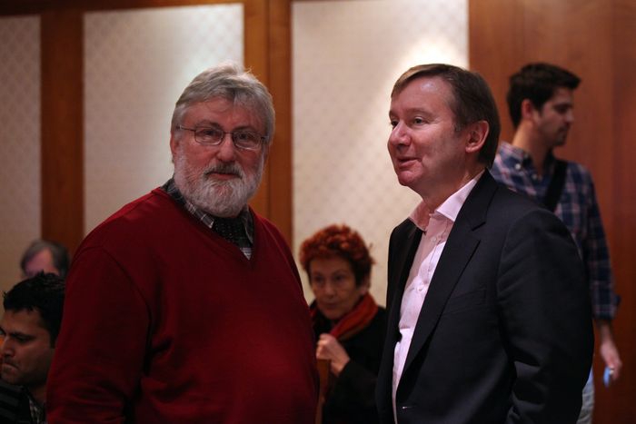 Организатор турниров в Майнце, глава делегации Ананда на мачтах за корону Ханс-Вальтер Шмитт и главный редактор New in Chess Дирк Ян тен Гюйзендам