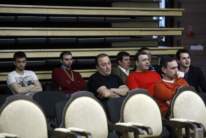 Кадры первой половины турнира. Участники, судьи, секунданты, журналисты, зрители.