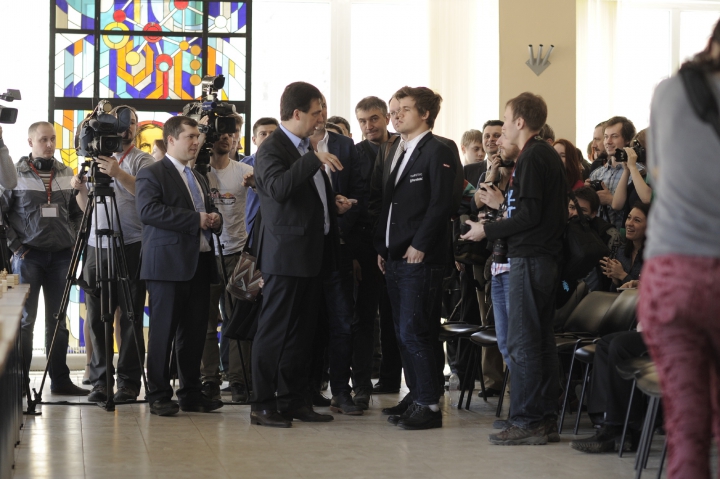 8 апреля Магнус Карлсен по приглашению Ассоциации выпускников Физтех-Союз и Runa Capital.гостил в Долгопрудном у студентов и преподавателей Московского физико-технического института. Чемпион мира ответил на многочисленные вопросы любителей шахмат и дал сеанс одновременной игры. Ведущей вечера была Тина Канделаки.
